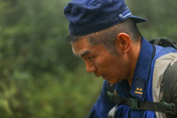 19日,森林消防队伍第二届“火焰蓝”灭火专业技能尖子比武活动进入第三个比赛日,图为野外山地负重行军科目比武活动现场。