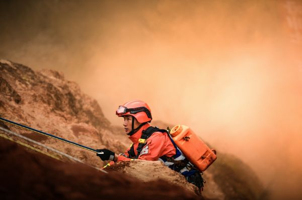 19日,森林消防队伍第二届“火焰蓝”灭火专业技能尖子比武活动进入第三个比赛日,图为特殊地形点烟处置科目比武活动现场。