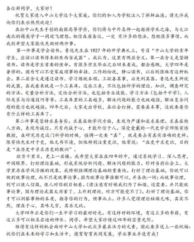 ▲毛蕴诗教授在中山大学2013年开学典礼上的致辞稿