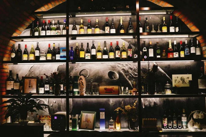 最吸引人的是休息区摆满烈酒、酒杯、和各种中古摆件的酒柜,坐在酒柜旁,主理人从美国千里迢迢运回来的中古皮沙发上,像是推开了禁酒令时期地下小酒馆的大门。
