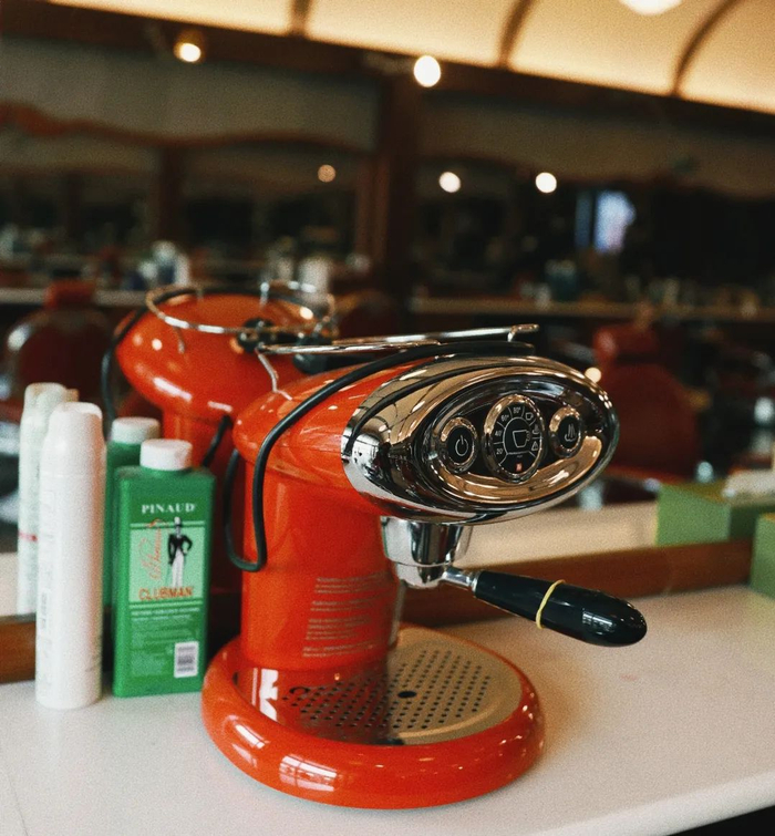实木地板、砖墙和红色的靠背椅仿佛一下子将人拉入上个世纪的电影海报中,午后的阳光从落地窗中直射进来,照在擦得锃亮的剪发刀和器具上,复古感有了!