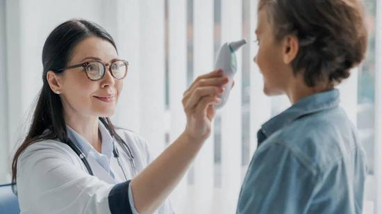 测温前将体温计调至体温模式,大部分额温计都需要对着鼻梁上方(差不多额头中央)的位置测量,不同产品可能略有不同,家长使用时严格按照说明书操作即可。