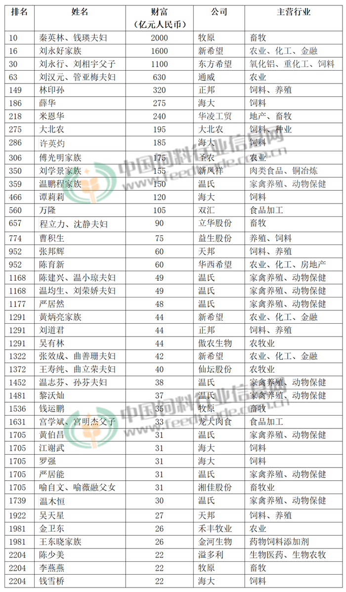 (中国饲料行业信息网根据2020胡润百富榜整理)