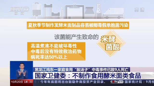 引发社会广泛关注的黑龙江省鸡西市鸡东县一家庭聚餐食用“酸汤子”引发食物中毒事件,又有坏消息传来。国家卫健委通报,该事件唯一的幸存者昨天(19日)也已去世,至此,该中毒事件已致9人死亡。现已查明致命食物就是被病菌污染的酸汤子。