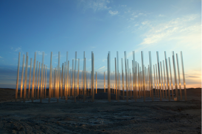 在做《无界》的过程中,激发了《风语者》的诞生。董书兵介绍,《风语者》其实是自己在做《无界》时观察到的一个现象——戈壁滩的风。这些风让《无界》的搭建过程充满了钢管发出碰撞的声音,而《风语者》就是对这些美妙声音的自然演绎。