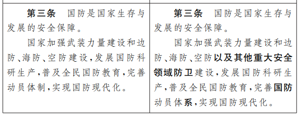 在强调国家加强武装力量建设和边防、海防、空防建设同时,补充提及了“其他重大安全领域”的防卫建设。