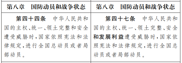 此后,“发展利益”一词又在修订草案中出现了三次。其中包括第八章国防动员和战争状态部分第四十七条的“中华人民共和国的主权、统一、领土完整、安全和发展利益遭受威胁时,国家依照宪法和法律规定,进行全国总动员或者局部动员”。