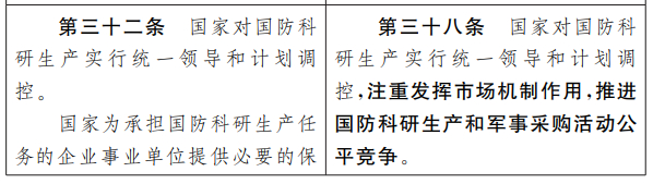 在国防科研生产和军事采购方面,修订草案提出了“完善国防知识产权制度”的新要求。而在国家对国防科研生产实行统一领导和计划调控的基础上,还应“注重发挥市场机制作用,推进国防科研生产和军事采购活动公平竞争”。