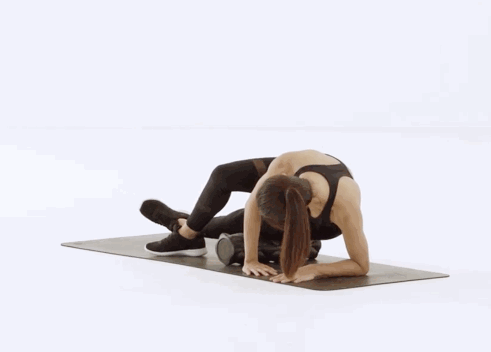俯卧在瑜伽垫上,双肘撑地,左腿伸直,右腿屈曲将泡沫轴压在大腿内侧的下方,从大腿根部至膝盖内侧来回滚动,在痛点上停留片刻。