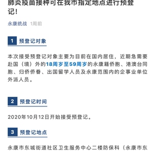 “急需出国(境)人员注意了,新型冠状病毒肺炎疫苗接种可在我市指定地点进行预登记!”10月12日下午,浙江金华永康市委统战部官方微信公众号“永康统战”发布了这样一条公告。