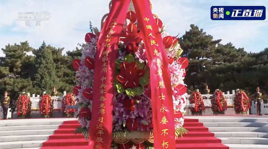 10月23日上午8时45分,辽宁沈阳抗美援朝烈士陵园敬献花篮仪式正式开始。以中共中央总书记、国家主席、中央军委主席习近平名义敬献的花篮摆放在烈士纪念碑正前方。花篮红色缎带上写着“中国人民志愿军烈士永垂不朽!”