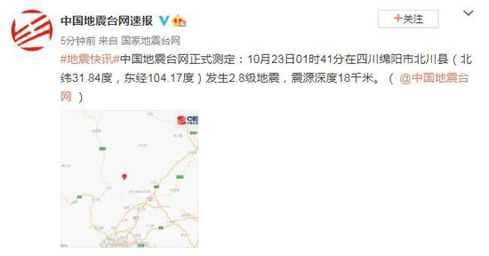 #地震快讯#中国地震台网正式测定:10月23日01时41分在四川绵阳市北川县(北纬31.84度,东经104.17度)发生2.8级地震,震源深度18千米。