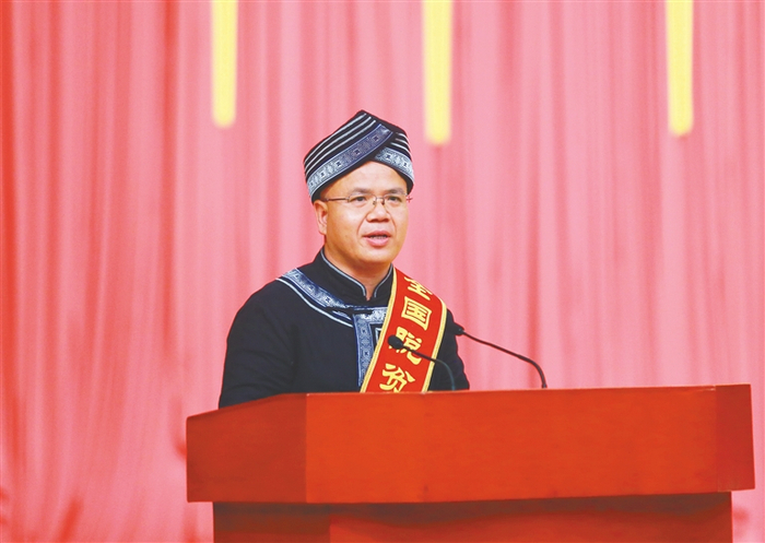 “这张照片我一直珍藏着,是2019年9月11日,十几位帮扶干部,用几块花布条和几根木棍,牢牢地把一张老式竹躺椅,绑成一个简易‘花轿子’,把91岁高龄的毛南族老人谭运日抬出大山的场景。经过4个多小时的艰难跋涉,终于把大山深处的最后一位‘守望者’抬了出来,搬进新房。”巡回报告前夕,黄荣彪去看望老人,曾经坚持“不想搬出大山”的老人,如今紧紧握着黄荣彪的手,笑道“不想回山里了”。