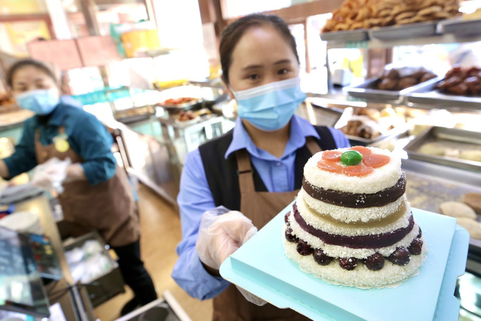 新京报记者了解到,今年,护国寺小吃总店还推出了九层糕塔。王新梅介绍,九层糕塔借“糕”字谐音,寓意高寿,期盼健康,九层也正合九九重阳之意。九层重阳糕搭配了九种原材料,除了像糯米、豆馅、大枣之类常见于糕类小吃的食材外,还将老北京传统的豌豆黄也加入其中。因为烹制时间长,护国寺小吃总店的九层重阳糕、寿桃等重阳节民俗食品都需要提前预订。