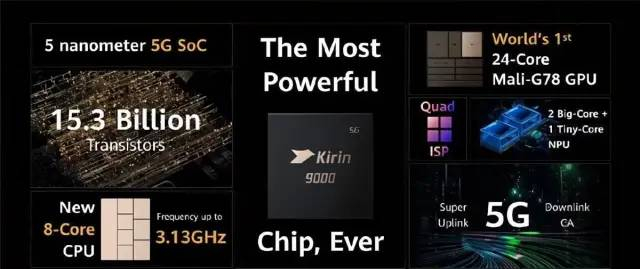 核心配置方面,华为Mate40系列搭载全新5nm工艺制程的5G SoC麒麟9000旗舰芯片,麒麟9000芯片采用八核CPU,24核Mali-G78 GPU,2大核+1小核NPU,并集成了华为最先进的ISP技术。根据华为说法,CPU、GPU、NPU性能遥遥领先竞争对手。
