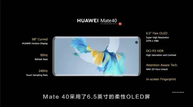 Mate40 上搭载的是一块 6.76 英寸 2376×1080 分辨率的柔性 OELD 屏,具备 240 触控采样率和 90Hz 高刷新率。最大的亮点是 Mate 系列终于用上了高刷新率屏幕,不过 Mate40 系列选择的是 90 Hz 而非 120 Hz 刷新率,目的是实现功耗与观感的平衡。