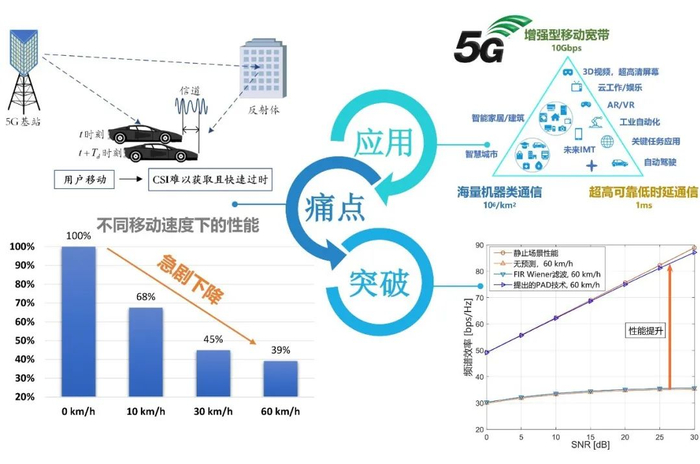 5G在实地部署中遇到了一个现实的挑战——“移动性难题”:与用户静止或低速移动环境相比,5G的关键性能指标在中高速移动环境下急剧下降。该问题已经成为当前阻碍5G高速数据传输的最大痛点。团队提出了一种基于无线信道的角度、时延、多普勒信道结构特征和5G Massive MIMO的极高空时分辨率的PAD信道预测技术。理论分析与实验验证都表明该技术可以使5G在中高速环境下的性能逼近静止环境的性能。