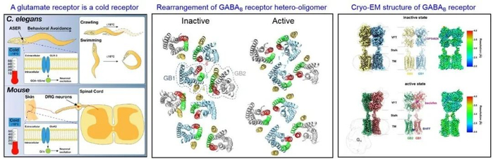 生命感知是最基本的生物学过程,神经递质受体在感受与传递信号中起着重要的作用。团队发现了兴奋性神经递质谷氨酸的离子通道受体具有感知寒冷的新功能,抑制性神经递质γ-氨基丁酸的代谢型受体多聚体信号传递新机制,并解析了其冷冻电镜结构。