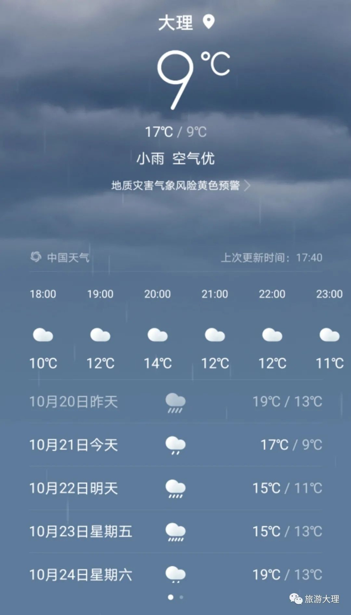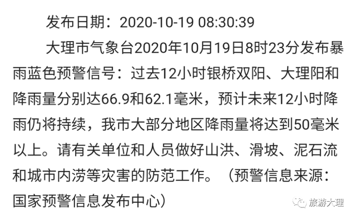 10月16日以来,受偏南气流和冷空气共同影响,大理市持续出现降雨降温天气。10月19日8时23分,大理市气象台发布了暴雨蓝色预警信号,19日大理市普降中到大雨,局地暴雨。10月21日16时,大理州气象局、大理州自然资源和规划局继续联合发布地质灾害气象风险Ⅲ级预警。天气预报显示,预计本周继续受冷空气影响,阴雨天气将持续至23日。