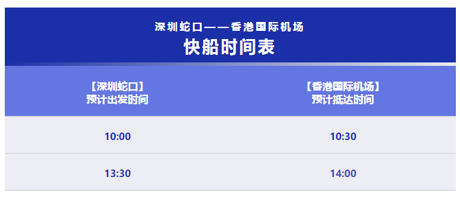每天营运两个由深圳蛇口至香港国际机场的单向快船船班,详情如下: