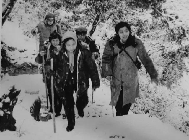 担任剧组场记的李诚儒(右一)与《西游记》导演杨洁(前)等人。