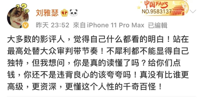 10月25日,刘雅瑟接受了新京报记者独家专访,回应了质疑,也聊了聊目前的创作心态——“任何作品都有喜欢它的人,也有人不喜欢。相对大家认知的,确实有些作品是不接地气,或者被判定为做作、矫情。电影艺术应该有所创新,任何看不懂的事情也不应该一味谩骂或是偏激地批评,更该多角度看事情,珍惜创作的过程。”