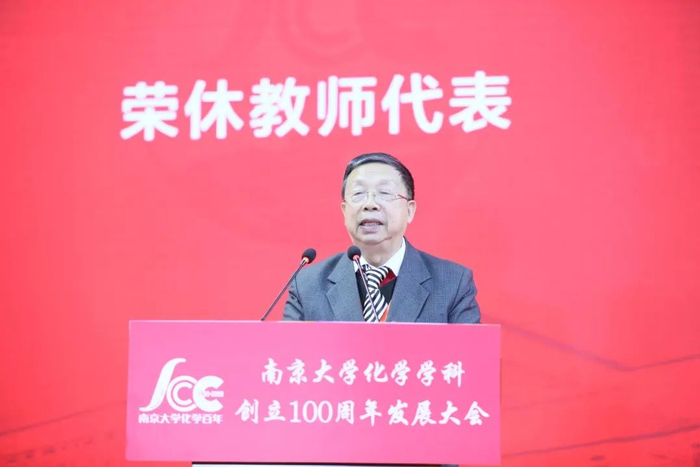 荣休教师代表、南京大学化学化工学院资深教授薛奇见证并亲身参与了南大化学学科到化学化工学院的成长与发展。他号召中青年科学研究者要向化学学科的前辈师长们学习,传承艰苦奋斗、敢为人先的精神。