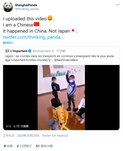 今天一早,一名自称在中国上海的网友“ShanghaiPanda”,称自己是最早将视频转发在推特上的人。早在9月24日,他上传了这则视频,并解释了视频中的发生地在中国,而非日本。