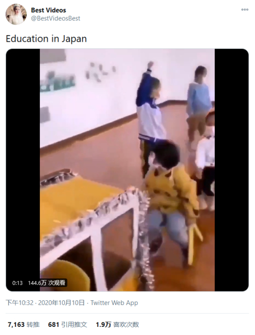 这条问题视频就转自一名视频博主10月10日发布的内容,原博文写着“日本教育”,观看量还翻了十几番,达到了近150万,七千多人转发。