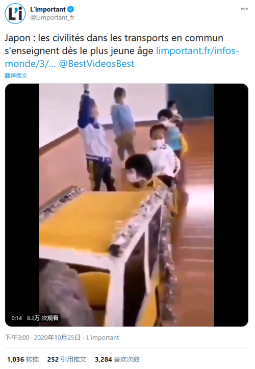 25日,法国网站“L'Important”在推特上转发了个视频,文中写道“日本:从小传授公共交通上的文明”。