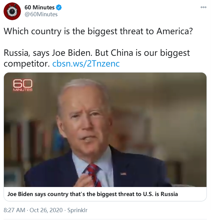 在刚刚过去的这周,美国哥伦比亚广播公司(CBS)《60分钟》节目在特拉华州的威尔明顿对民主党总统候选人拜登做了一场专访。根据CBS刚刚公布的实录,主持人诺拉·奥唐纳在采访中向这位前副总统问出了这样的问题,拜登的回答不是“中国”,而是“俄罗斯”。