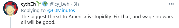 “美国最大的威胁是愚蠢。解决这个问题,别发动战争,一切都会好。”