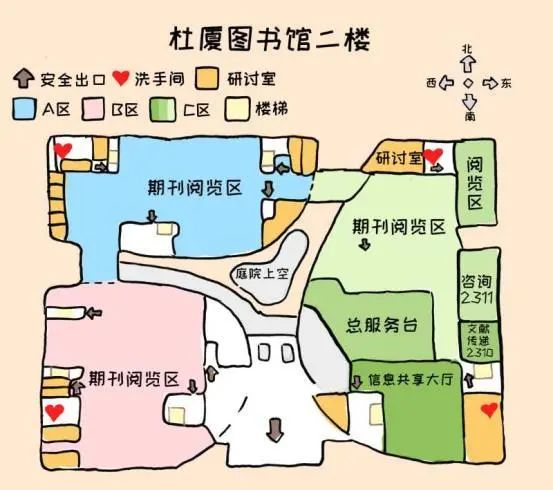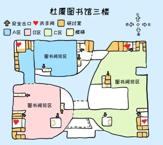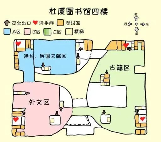 南京大学的杜厦图书馆,有着500多万册的图书,是江苏省藏书量最大、中国藏书量前三的高校图书馆。想要搞清这样一幢宏伟建筑的内部结构可不是一件容易的事,但你如果手握这样一份萌萌哒的手绘地图,那么一切问题都可以迎刃而解~