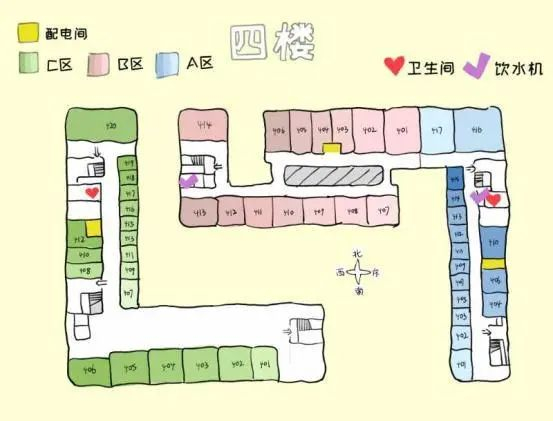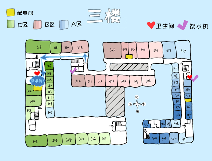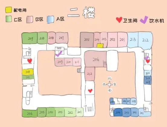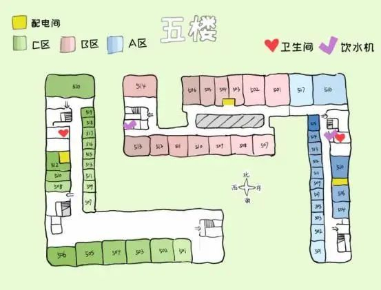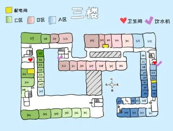 根据地图可以看到,A、C区每层相同位置(即图示打勾处)都有一个洗手间,此外1、2层B、C间隔处还增设了一个洗手间。