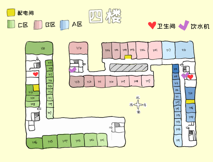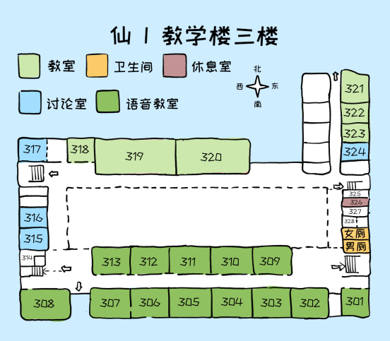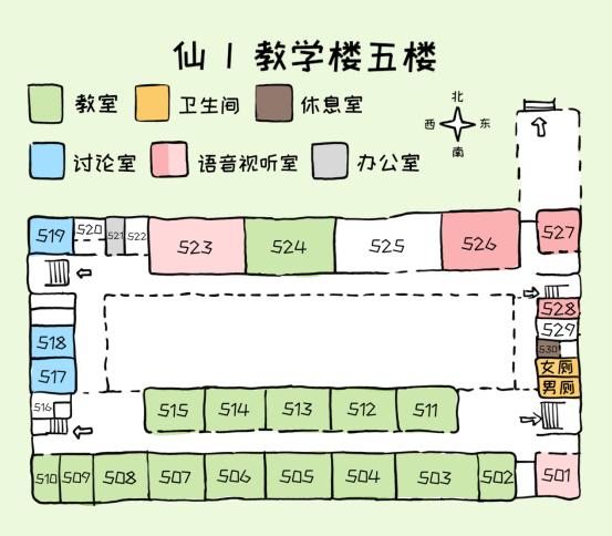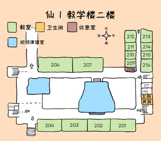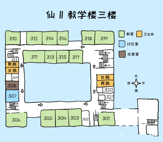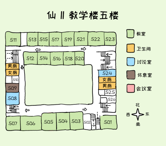 可以看到仙一每层楼结构大致类似,教室排布除了四层较为特殊之外,其他四层楼都比较规律,同学们可以结合地图和相关指示找到自己的目的地。