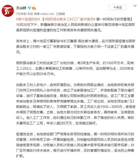 发布会上,喀什地区行署副秘书长艾赛提·吾拉音木通报,这次疏附县疫情与疏附县站敏乡三村的一家工厂关联度较高,下面我向大家介绍一下这家工厂的基本情况。