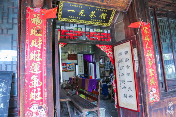 “一元茶馆”其实叫聚华园茶馆,是村里一家有着200多年历史老茶馆。如今的茶馆主人潘福平夫妇已经是这里的第四代掌柜了。