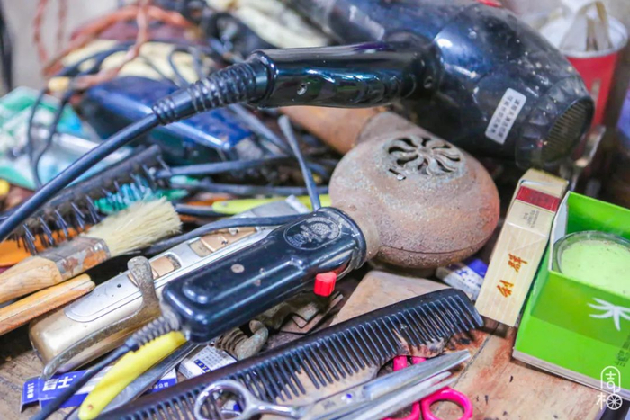 茶馆的一侧是一个古旧的剃头台,摆满了各式老旧的剃头工具。