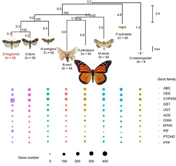 研究人员对草地贪夜蛾进行了染色体水平的基因组组装,并比较了美国、非洲和中国的多个草地贪夜蛾种群基因重测序结果,发现来自美国的草地贪夜蛾样本同时具有C(玉米型)和R(水稻型)两个品系,而中国和非洲的样本只有C品系;中国和非洲的草地贪夜蛾种群与美国的种群之间有着显著的遗传分化,入侵中国的草地贪夜蛾种群极有可能来自于非洲。基因组学分析显示:入侵中国的草地贪夜蛾细胞色素P450、解螺旋酶等多个基因家族出现显著扩增,其中P450家族多达425个基因(达近缘种斜纹夜蛾的3倍),且有283个为草地贪夜蛾特有。在获得染色体水平基因组的基础上,研究人员进一步测定了23种农药处理后的草地贪夜蛾转录组水平差异。发现不同农药处理后的草地贪夜蛾转录组谱产生了不同的变化,几个与解毒相关的基因,如:AOX, UGT 和 GST对农药处理产生了特异性反应。该研究结果有助于更有效地理解草地贪夜蛾对农药的抗性水平,为制定有效的防控措施提供依据。