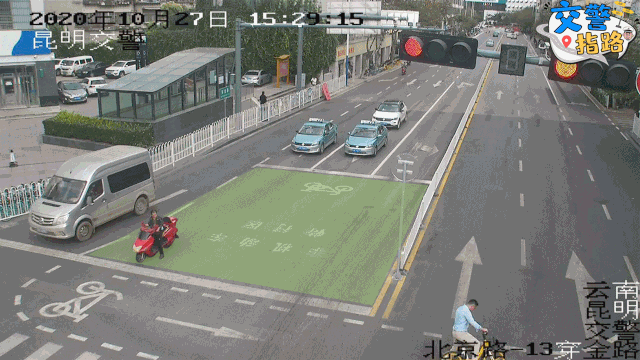 在北京路与人民路、东风路、拓东路交叉口等路口,你留意就会看到车行道停车线与人行横道(斑马线)间,有用白色交通标线(虚线)漆划出的一块区域▼