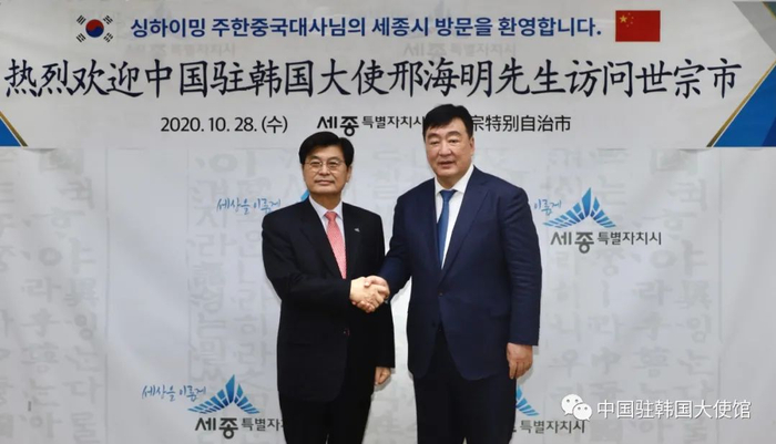 10月28日,邢海明大使会见韩国世宗特别自治市市长李春熙。