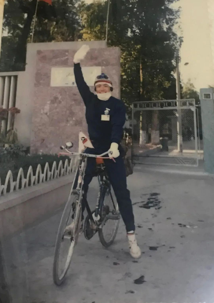 左图:黄建中骑车去海南岛出发前在西门的留影