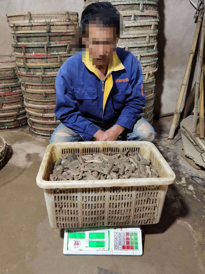 这些江鱼从何而来,是个别村民捕捞的、还是有组织行为?带着种种疑问,民警们在一旁观察。不一会儿,洗鱼的人走进了村里一户农宅。在农宅大院内,民警看到大量带有新鲜淤泥的鱼筐,打开其中一筐后发现,里面竟装着满满的跳跳鱼。民警当场将这名人员控制,经询问,他和盘托出了非法抓捕跳跳鱼的事实,并交代同伙正在滩涂上抓捕跳跳鱼。