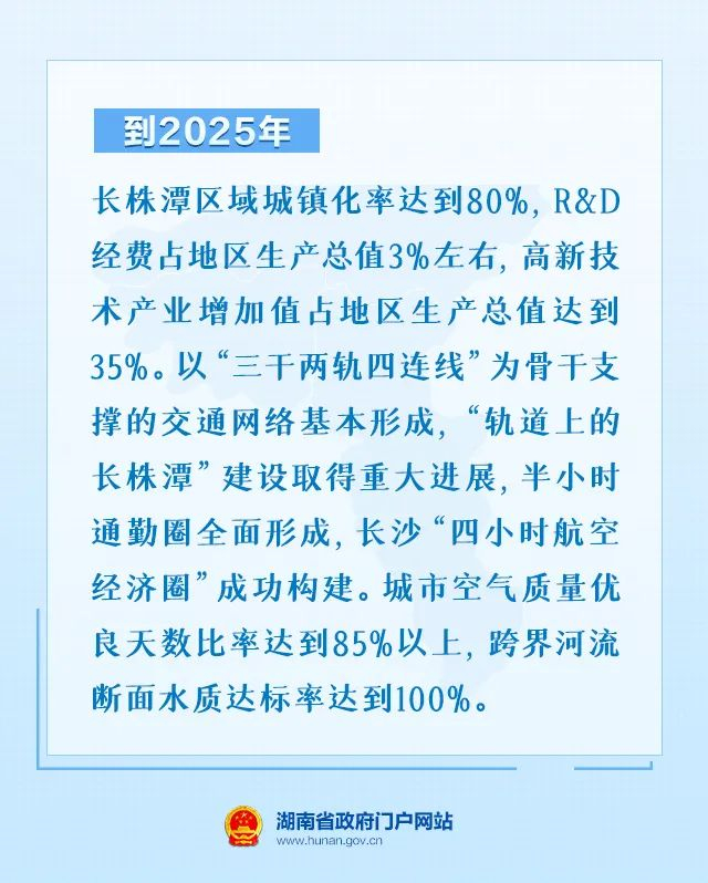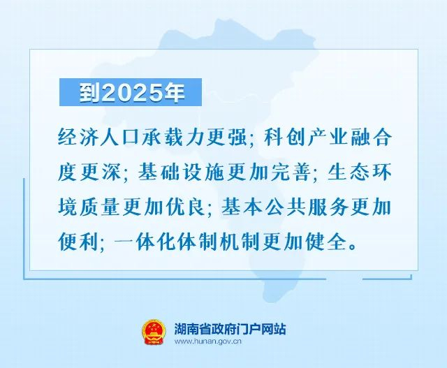 近期目标:到2025年,长株潭区域竞争实力、辐射带动能力显著增强,高水平基础设施、现代公共服务、社会保障等领域一体化取得重大进展,融城融合发展格局全面形成。