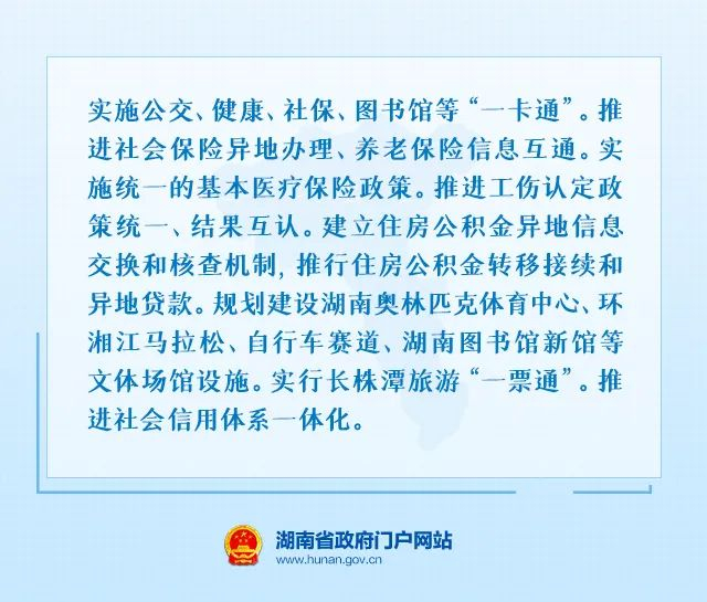 五是推进公共服务共建共享。深化公共服务领域合作,推进公共服务标准化便利化,共享高品质教育医疗资源,推动文体旅游合作发展,共建高效有序社会环境,共同提升公共服务水平和质量,使一体化发展成果更多更公平惠及长株潭三市人民,并辐射带动更大的区域,惠及更多地区的人民。