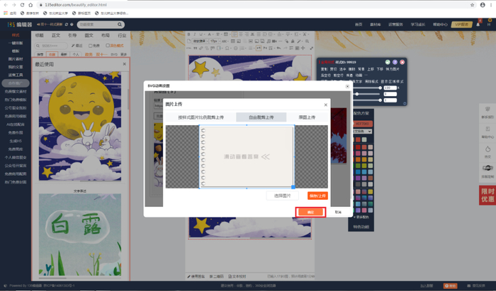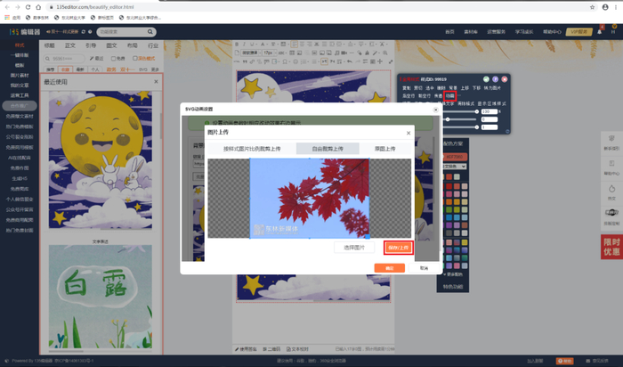 首先,我们清空样式,选择一个合适的特效。点击“动画”,我们就可以进行图片的替换。将枫叶的照片上传,替换第一张图片,闪现的特效将会出现。同理,将第二张图片替换成枫叶的图片,出现的效果就是滑动后的静态效果,同样上传保存。
