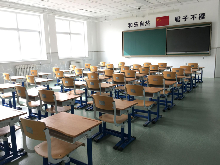 教室里的可伸缩桌椅摆放整齐。