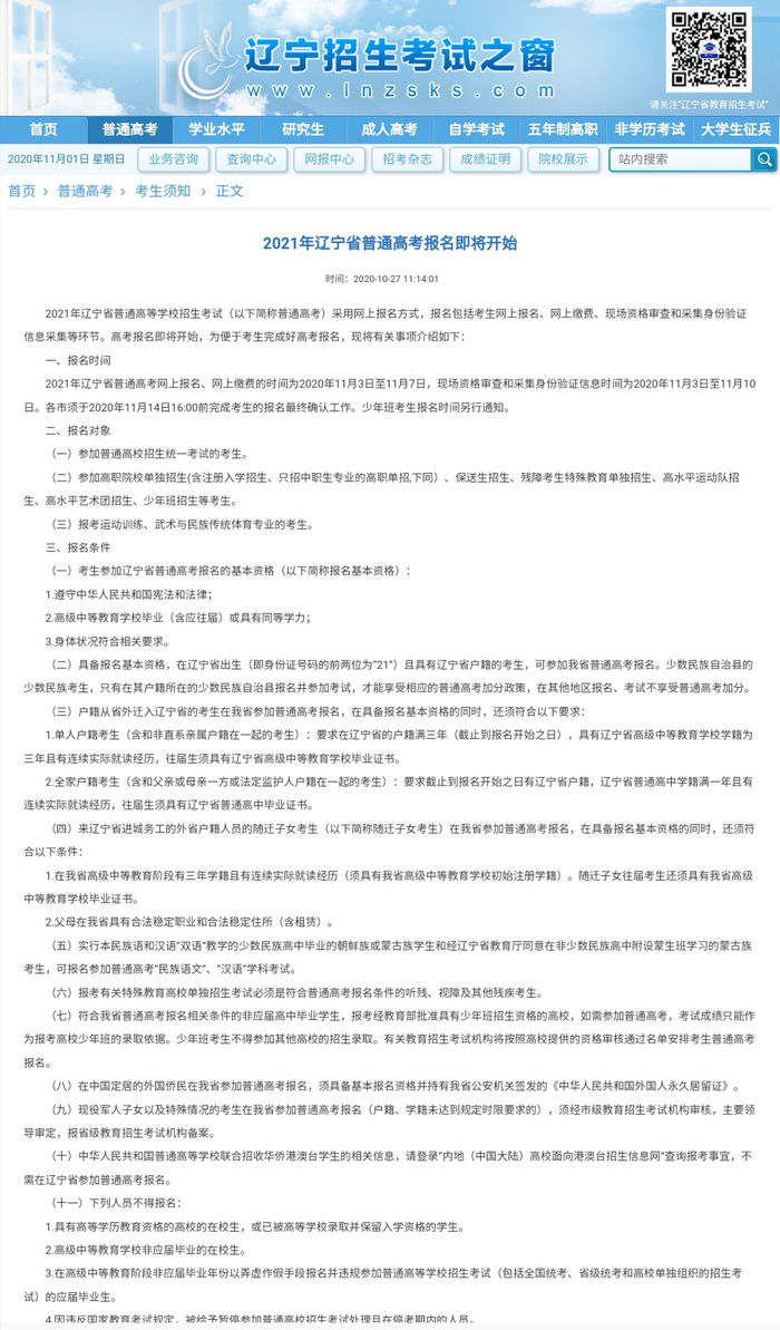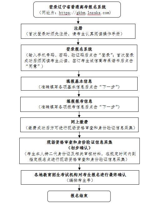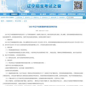 辽宁省是全国第三批高考综合改革省份之一,新政策从2018年秋季入学的高一年级学生开始实施。2021年高考采用网上报名方式,网上缴费时间为:2020年11月3日至11月7日,现场资格审查和采集身份验证信息时间为:2020年11月3日至11月10日。考生在报名规定的时间内,登录辽宁招生考试之窗网站(www.lnzsks.com)或使用Chrome、360(极速模式)、IE9及以上版本的浏览器登录“普通高校招生统一考试信息服务平台”均可。