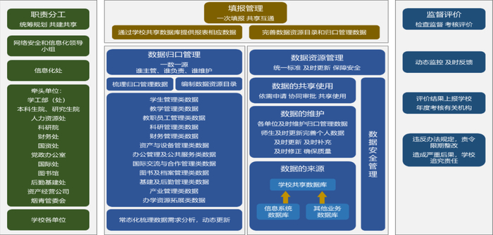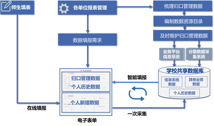 “一表通”通过对学校数据采取归口管理、有效整合、智能填报等数据治理手段,实现学校报表数据“一次填报,共享互通”,有效减轻师生及各单位填表负担。