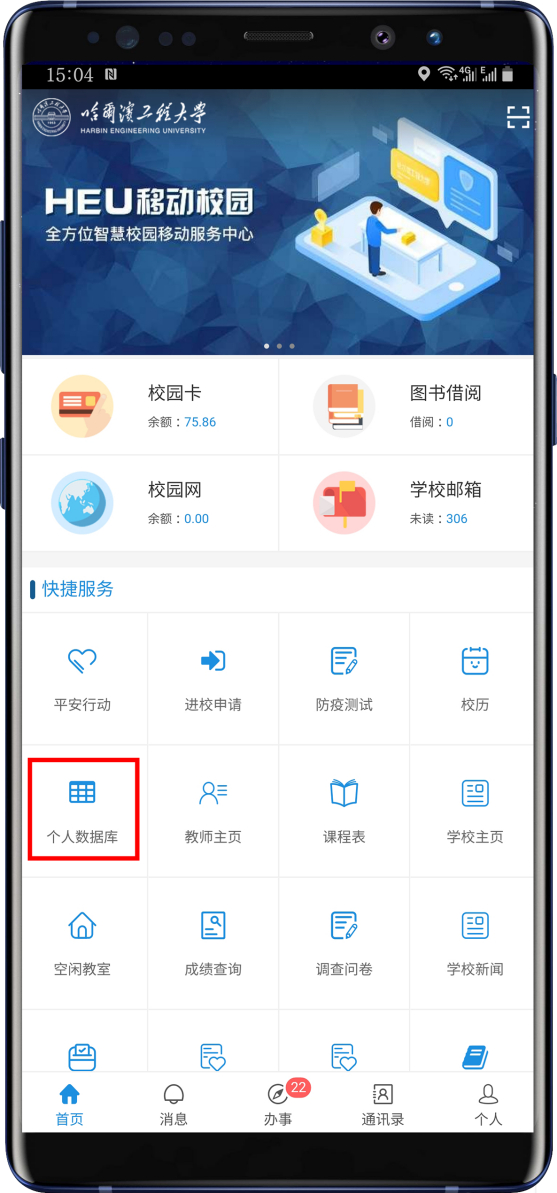 师生用户也可使用“移动校园”APP,点击“个人数据库”访问师生个人数据中心。